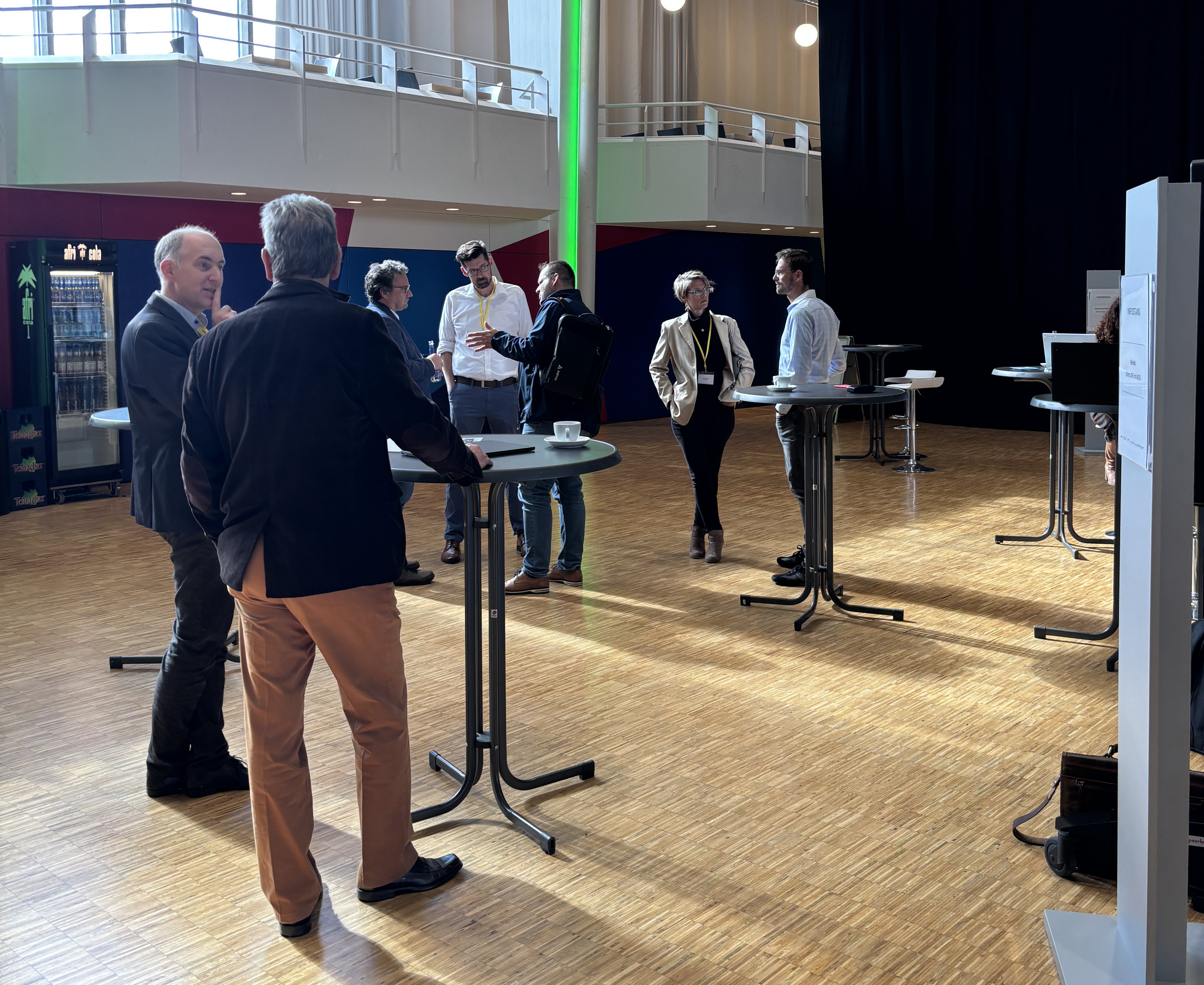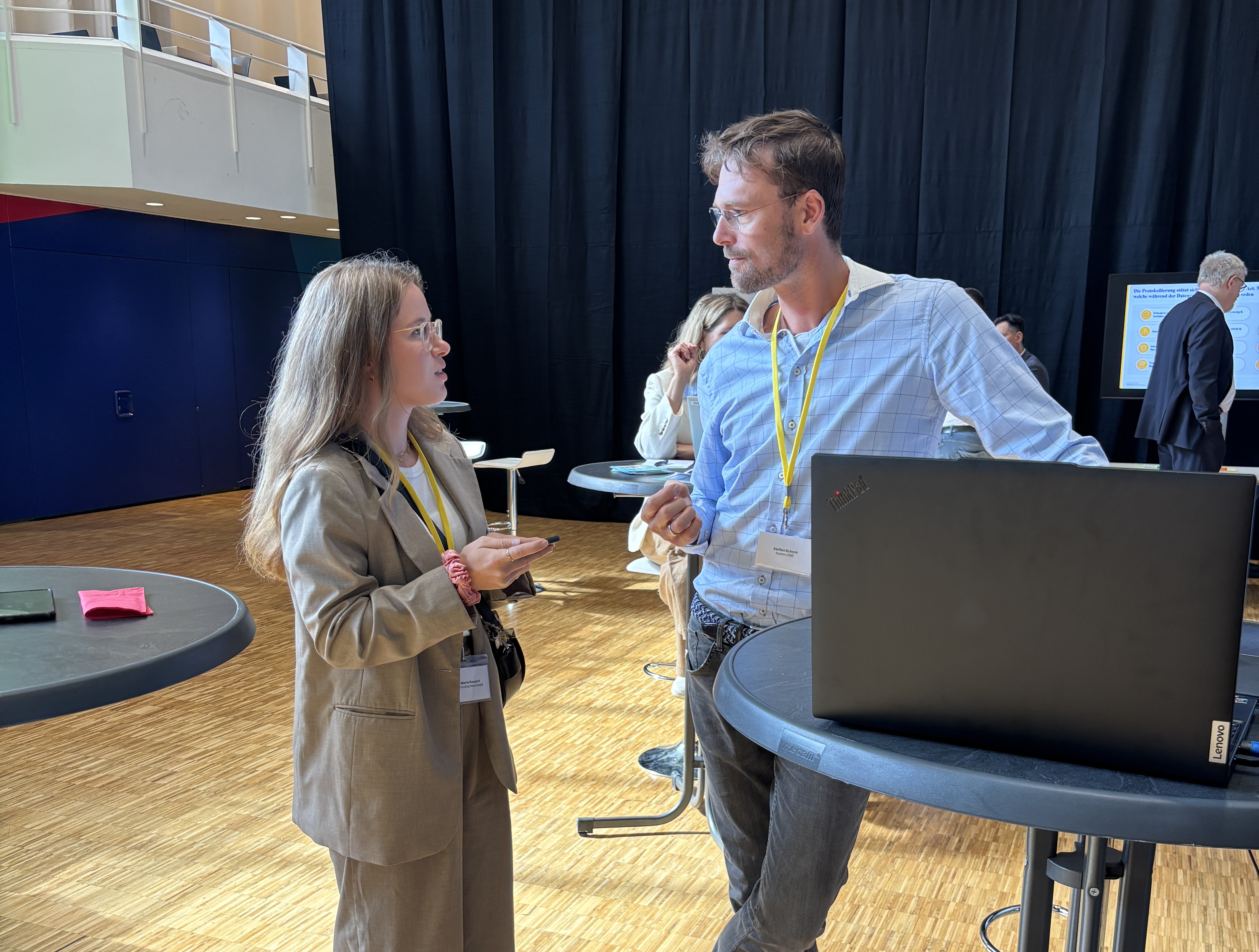 Doch nicht nur der Wissenserwerb, auch der fachliche Austausch und das Netzwerken waren ein wesentlicher Bestandteil der Klausurtagung und wurden rege genutzt. Hier im Bild: Bettina-Maria Kaupert, Digtialisierungskoordinatorin des Landratsamtes Breisgau-Hochschwarzwald und Steffen Schenk, ÖGDigital-Pilotprojektmanager der Komm.ONE, im Gespräch.